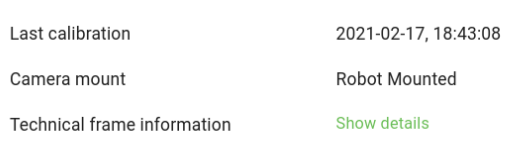 To inspect the details of the existing calibration, click the Calibration button on the top bar of the Pickit web interface. You will be presented with a summary of the last calibration associated to the active camera. If no calibration has been ever performed, it will also be indicated.
