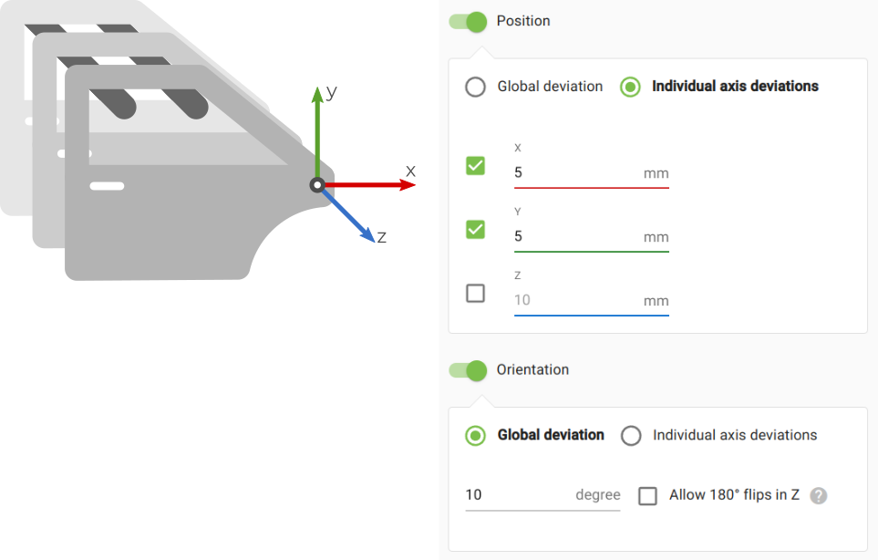For example, in the de-racking application shown below we expect car doors to not deviate too much from an expected position in the X and Y directions, but we want to leave the Z (rack) direction unconstrained. For orientation, it’s sufficient to specify a single global deviation.