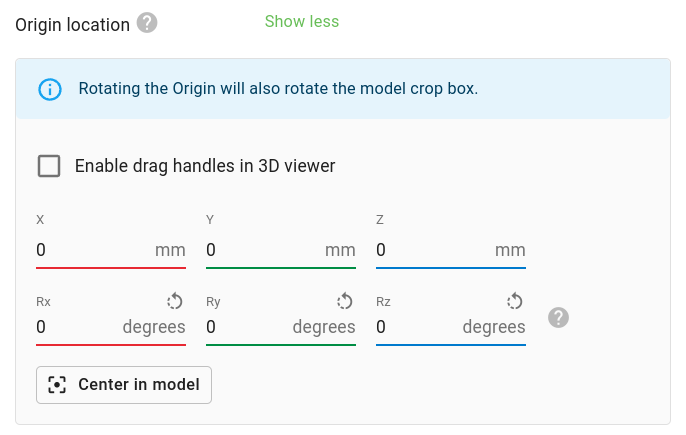 The location of the model origin can be edited either by setting exact values, or interactively via Enable drag handles in 3D viewer.
