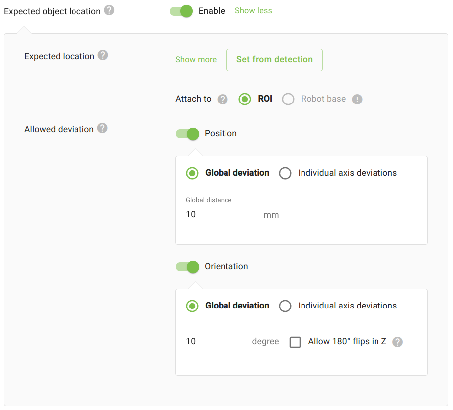 Origin(not its pick point). This can be done by taking the location of an existing detection (recommended), by interactively using the 3D drag handles, or by manually setting the values.The allowed deviation of a detected object from its expected location. It can be specified as a global position and/or orientation value, or on individual axes