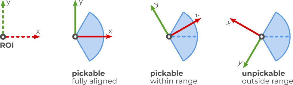 By default, the desired pick orientation is to be satisfied within 180°. If a lower value is set, objects will be labeled as unpickable if the desired orientation is not satisfied within that range. In the example below, we want to align the pick point X axis within 60° of the ROI X axis, and show the three possible outcomes: Fully aligned, not fully aligned (but within range), and outside the range.