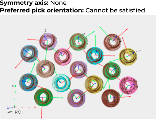 When an object model has multiple pick points, a symmetry axis or a tool with flexible pick orientation, there can be some freedom in how the pick point is oriented. The desired pick point orientation allows pointing a pick point axis as close as possible to one of the ROI frame axes, or a specific location, like the ROI frame origin or the ROI center.