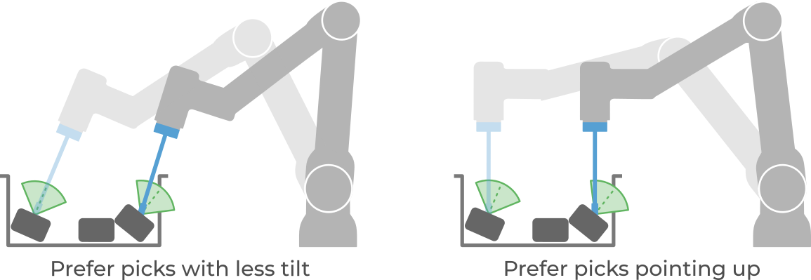 When Prefer picks with less tilt is selected, the tilting flexibility will only be used to make a point pickable, such as to avoid a collision (above left). If apart from tilting, the tool additionally allows rotating about the Z-axis, this rotation will be used to align as close as possible to the desired pick orientation. This is the default setting, and is recommended whenever tilting the tool decreases the likelihood of pick success. For instance, some suction cups might have more difficulty establishing vacuum when highly tilted.