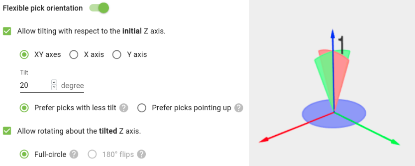 On the other hand, when Prefer picks pointing up is selected, the tilting flexibility will be used to align as much as possible with the desired pick orientation, which points up. Prefer this setting when you want to minimize tilting of the robot flange.