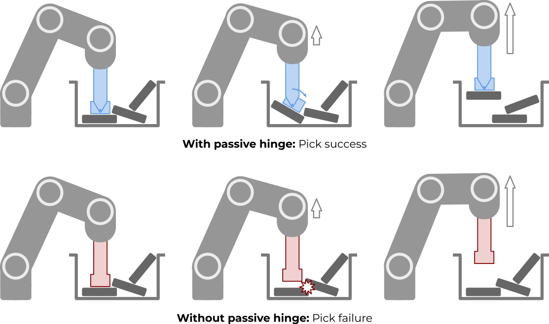 The passive hinge also increases the likelihood of successfully extracting a grasped part from the bin. When a part to pick is partially blocked or constrained by surrounding bin parts, the passive hinge motion allows the grasped part to move around them during bin extraction in a way that the grasp is more likely to be maintained.