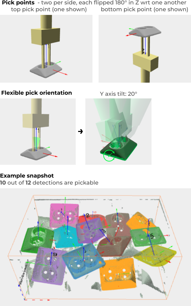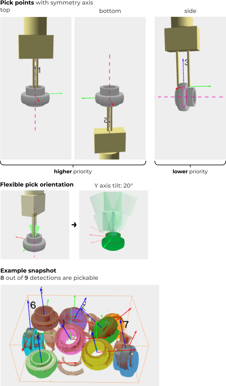 This part has a symmetry axis and it’s possible to pick it from the top, bottom, or side. The picking configuration is as follows: