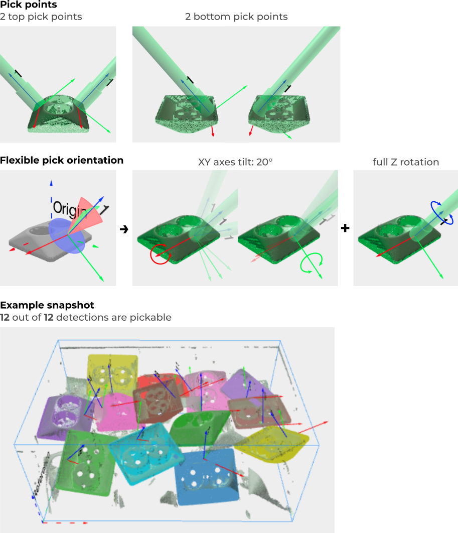 This article provides some example applications on how to smartly pick objects with Pickit. It presents in a practical way how to make good use of multiple pick points, symmetry axes, flexible pick position and robot tool flexible pick orientation to increase the likelihood that an object is pickable.