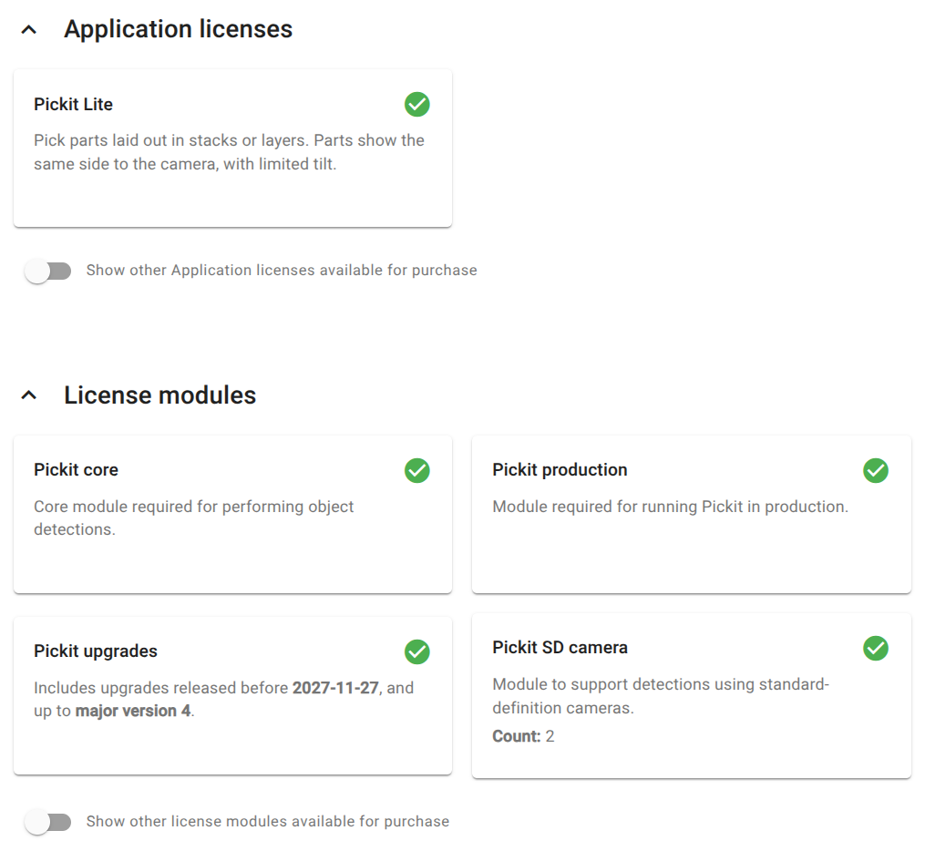 These settings allow you to inspect the details of the license file installed in your Pickit system. You can also learn about available extensions.