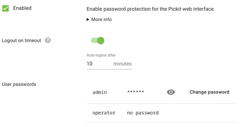 This feature enables two user types for the Pickit web interface: admin and operator. Admin is password-protected and has full privileges to configure the application and the Pickit platform. On the other hand, Operator can only monitor the application and collect data for troubleshooting and support.