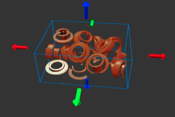 The image below left displays the full field of view of the camera, including ground plane, the bin and its contents, as shown by the 3D view. The image below right displays the ROI box contents, as shown by the Points view.