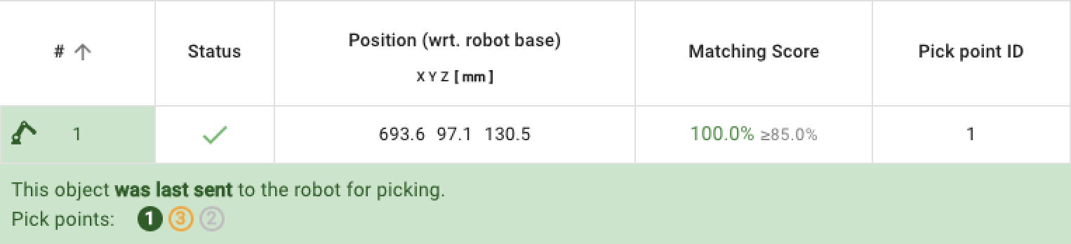 Object number: Pickable objects will be sent to the robot in this order. The object that was last sent to the robot for picking is indicated by a robot icon. Learn more about specifying the object order here.