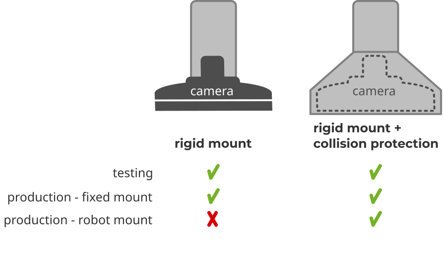 The camera should be rigidly mounted to the robot, and well-protected against unexpected collisions in all directions.