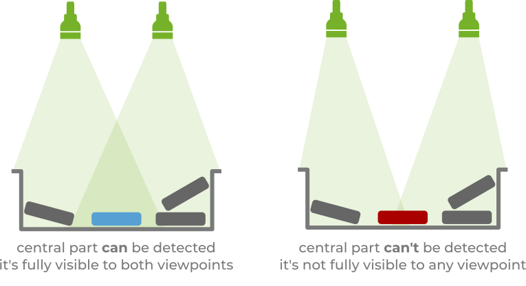 Finally, being able to run detections from different camera orientations can increase the likelihood of detecting more parts. This strategy can be particularly useful for detecting parts with reflective regions, that are occluded, or close to bin sides.