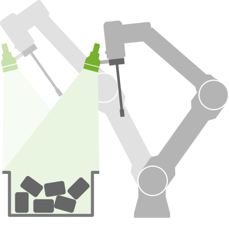 Pickit cameras are compact and lightweight, which allows them to operate mounted on a robot. A robot-mounted camera is very flexible, allowing to perform detections from multiple detection points, that is, multiple camera viewpoints. This enables a single camera and robot pair to operate on large detection regions (deep bins, high pallets), to pick from multiple stations, and can also produce more consistent part detection performance.