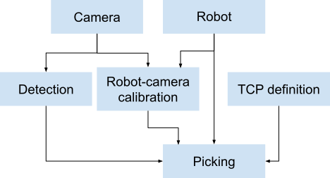 As shown in the diagram, some sources of inaccuracy are independent (like the robot accuracy) while other are coupled. For example, the robot-camera calibration accuracy is affected by both the camera and the robot accuracy. When investigating the picking accuracy of an application, it is recommended to first check the independent sources of error before checking the coupled ones.