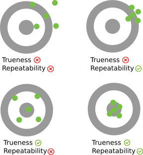 Trueness and repeatability are therefore two independent concepts. As shown in the image below, a measurement with a good trueness can have a bad repeatability and vice versa. Good accuracy can only be obtained with both good trueness and good repeatability.