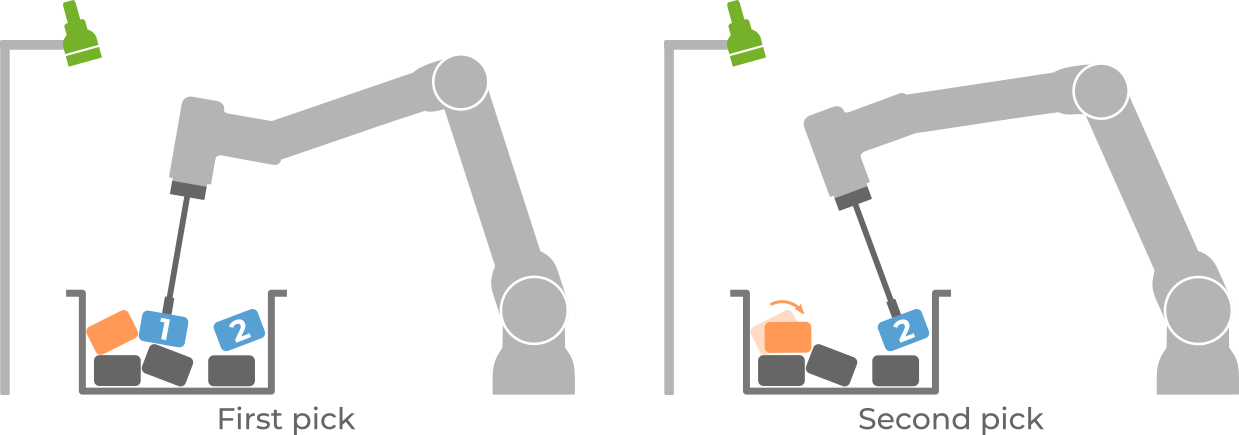 One way to reduce this impact to a fraction is to pick more than one object per detection run. This is only applicable to situations where picking one part doesn’t disturb much the location of neighboring parts. This is the case, for example, when parts are presented in a semi-structured way, such as in depalletizing, where the robot can pick all detections in a layer.