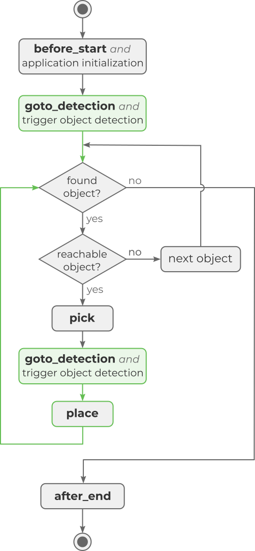 The object is detected and reachable (i.e. pickable): Execute pick and place and trigger the next object detection.