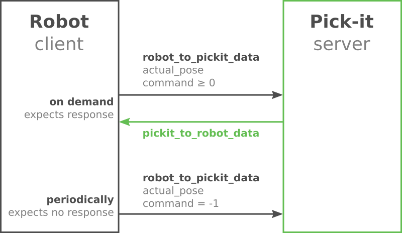 The robot and Pickit exchange information in a request-response pattern, where the robot acts as the client and Pickit as the server. The robot sends a request, such as e.g. an object detection, to Pickit, which replies with a corresponding response. All requests are implemented in a purely synchronous fashion, and it is up to the client to ensure that no new requests are sent before having received a response for the previous request.