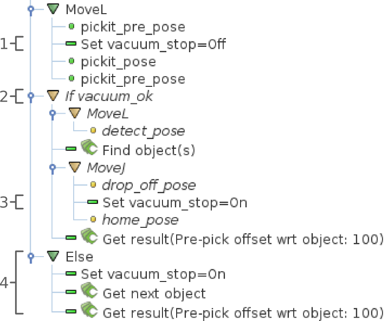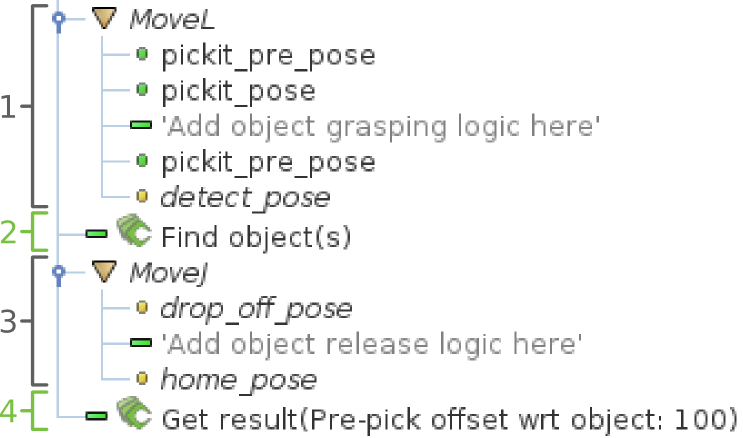 The program is composed by standard URScript commands and commands specific to the Pickit URCap plugin, which are identified by the green gripper symbol. A complete description of available commands can be found in The Pickit URCap interface article.